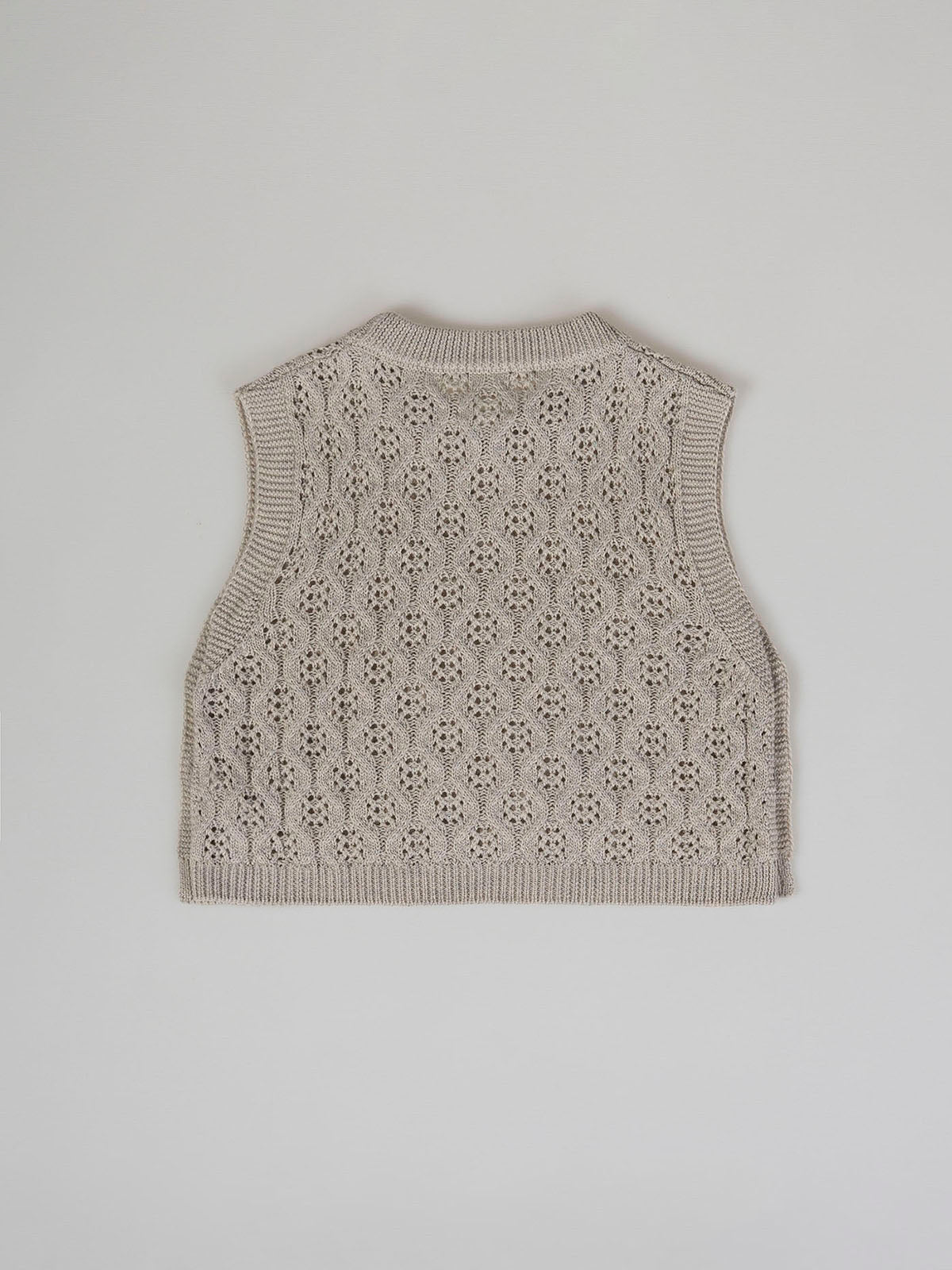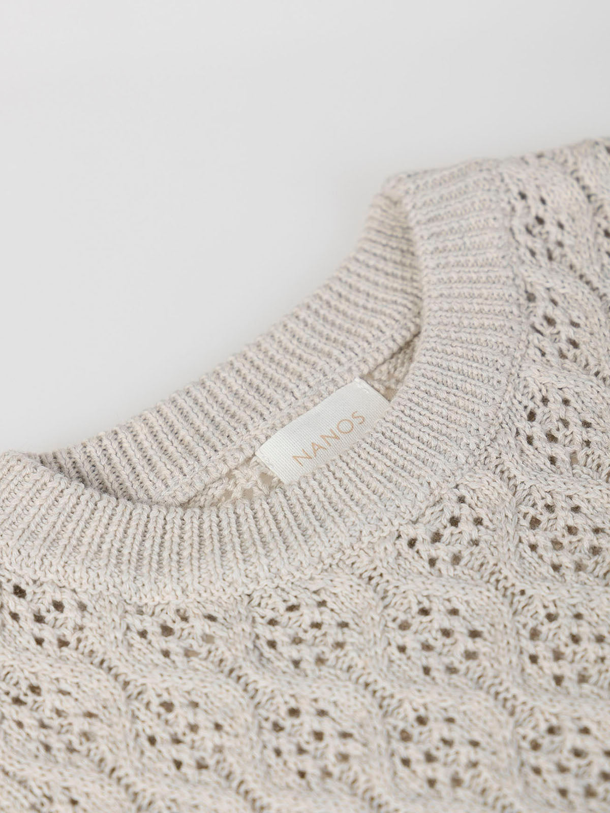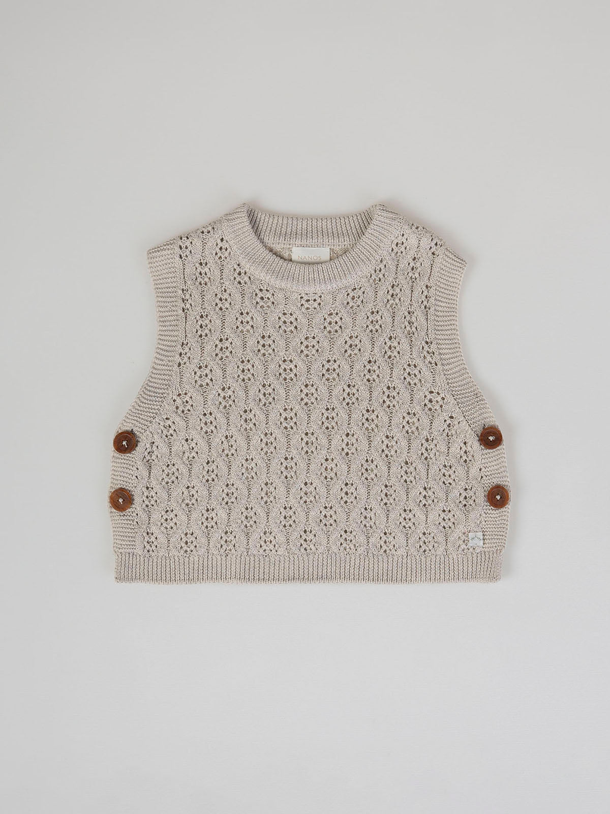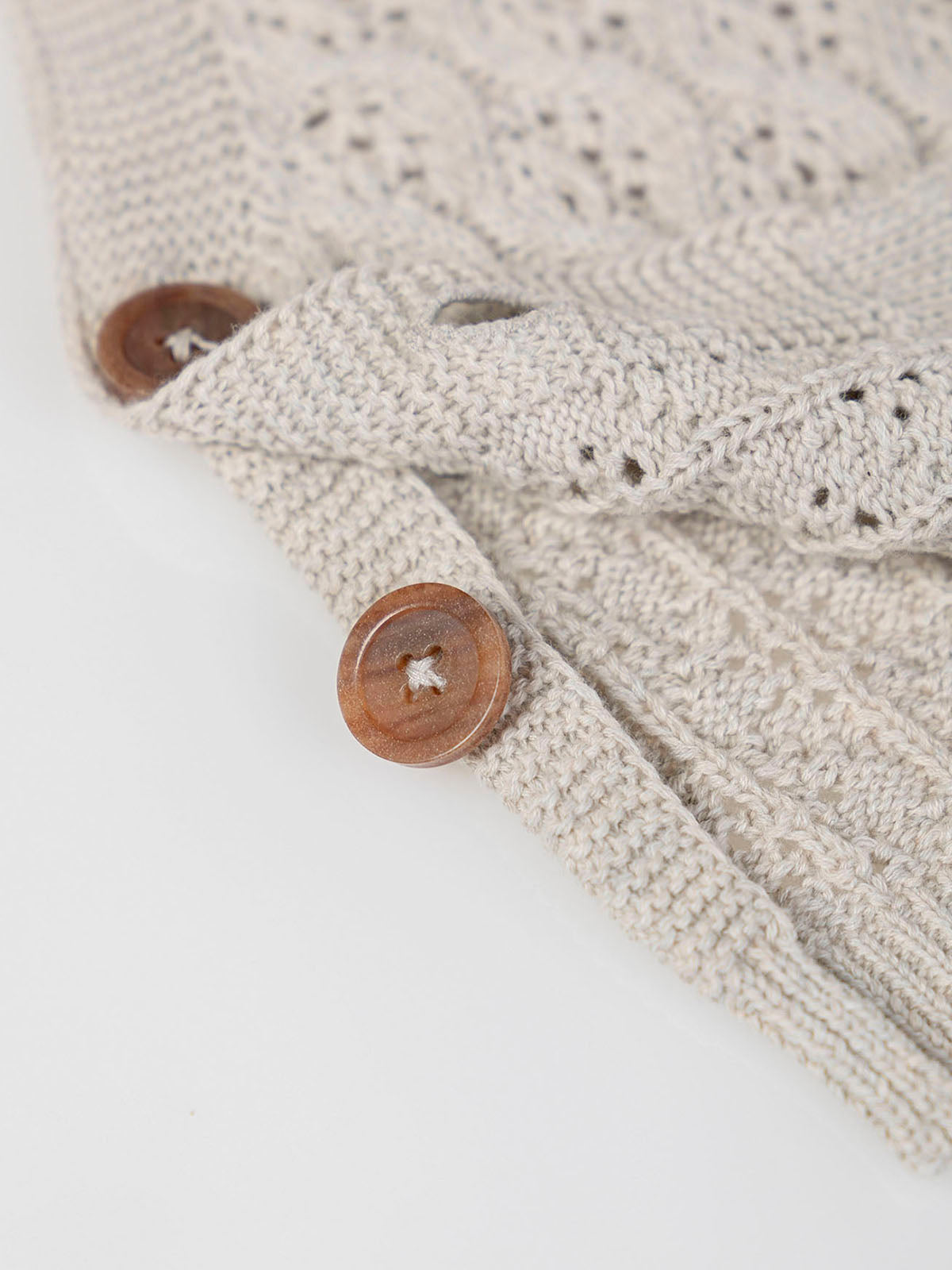 Chaleco de punto estructura con abertura lateral en color beige para niña. Confeccionado en 100% algodón. Cuello redondo con rib y aperturas laterales con botones a contraste. Detalle chapa logo Nanos en bajo delantero derecha.