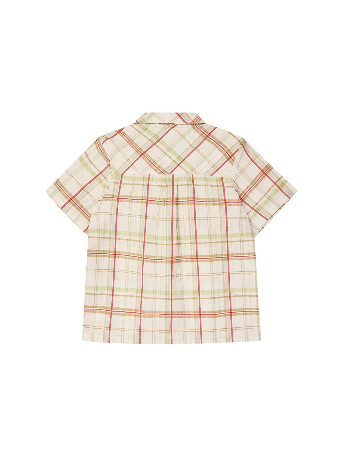 Camisa de manga corta de lino y algodón para bebé niño con estampado de cuadros en rojo y verde. Cierre delantero con botones. Detalle logo corona Nanos en delantero izquierdo.