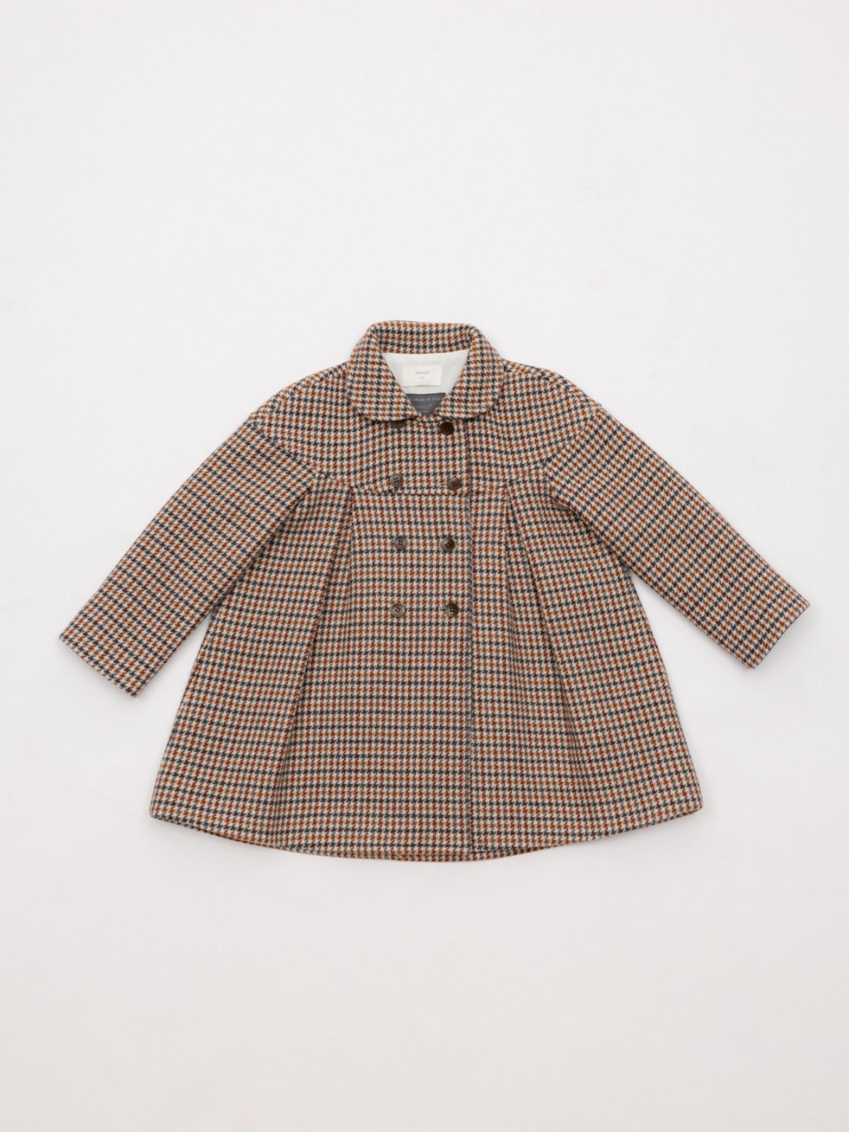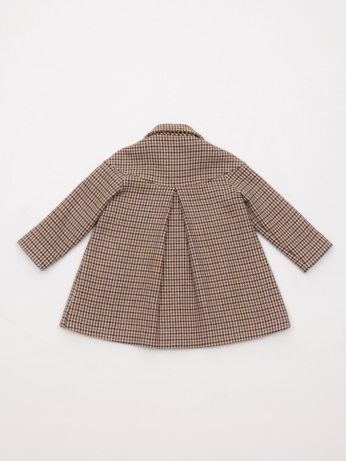Abrigo cruzado de Manteco para niña con estampado pata de gallo en tonos marrón, beige y azul. Cuello camisero. Cierre frontal con doble botonadura. Pliegues delanteros y pliegue trasero. Un clásico atemporal perfecto para los días de invierno.