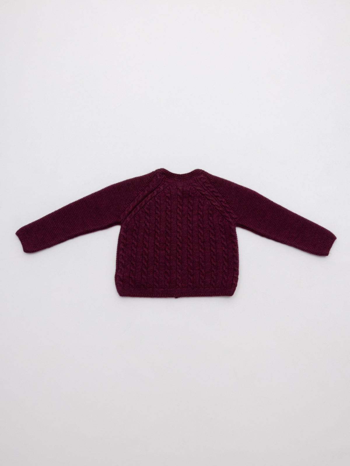 Chaqueta de punto para niña en color granate. Confeccionada en 80% acrílico, 10% lana y 10% viscosa. Detalle botones a contraste en madera. Manga ranglan con ochos en mangas y espalda. Chapita Nanos en lateral izquierdo. Ideal para el día a día o para ocasiones especiales, aportando estilo y comodidad en cada uso.
