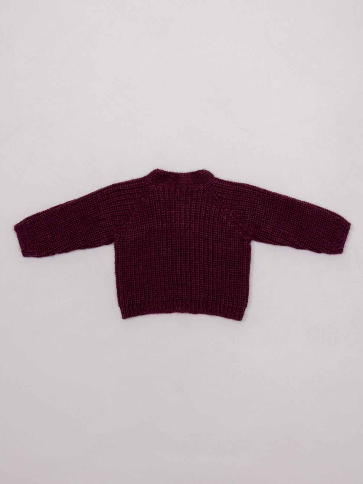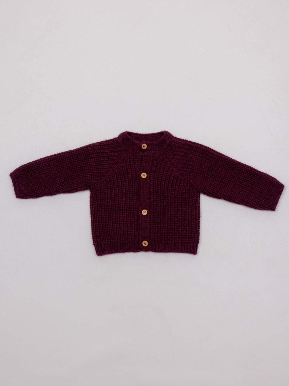 Chaqueta de punto rib para recién nacido en color granate. Confeccionada en 80% acrílico, 10% lana y 10% viscosa. Detalle botones a contraste en madera. Manga ranglan. Ideal para los días de invierno, sin perder estilo y comodidad.