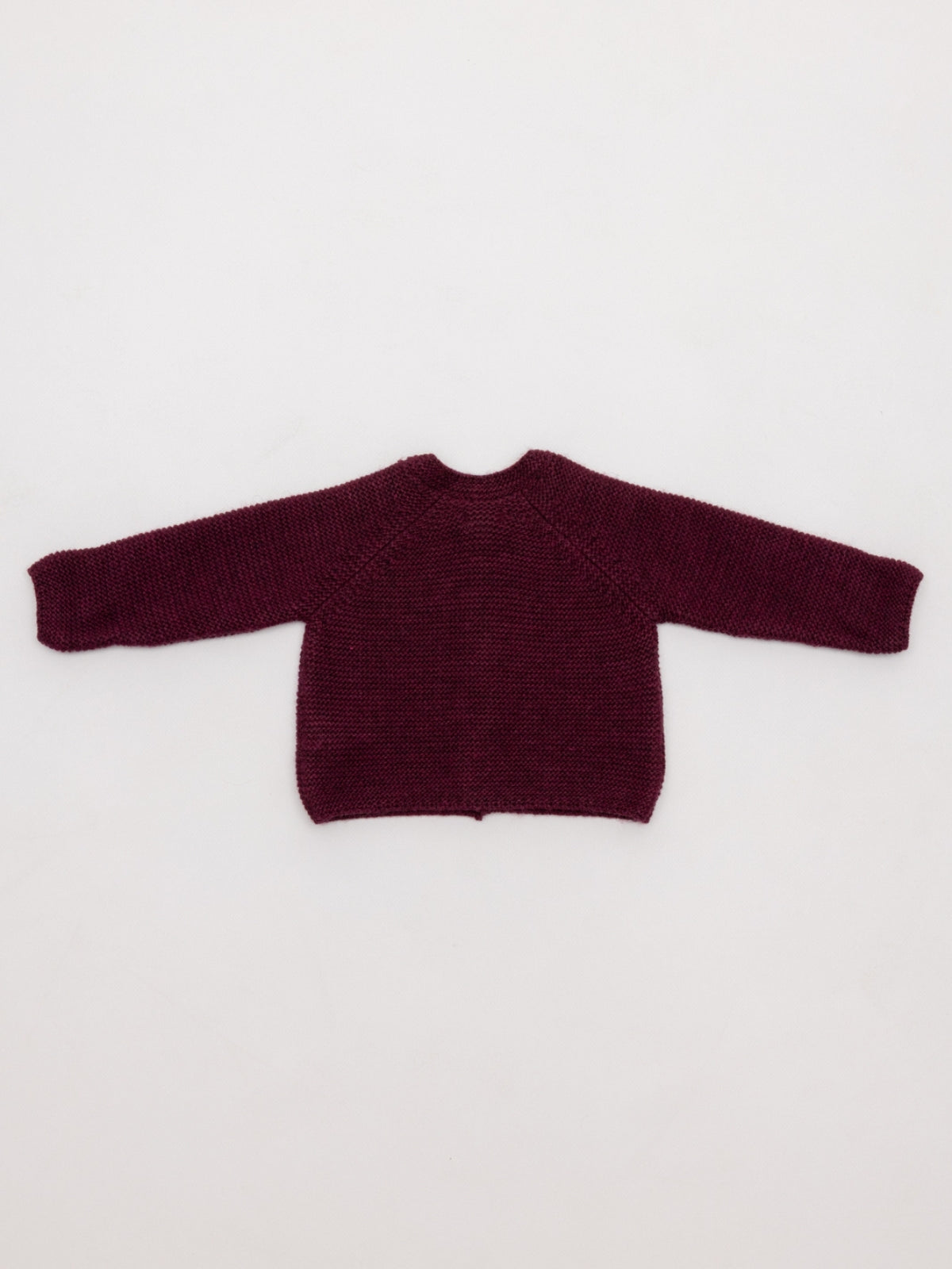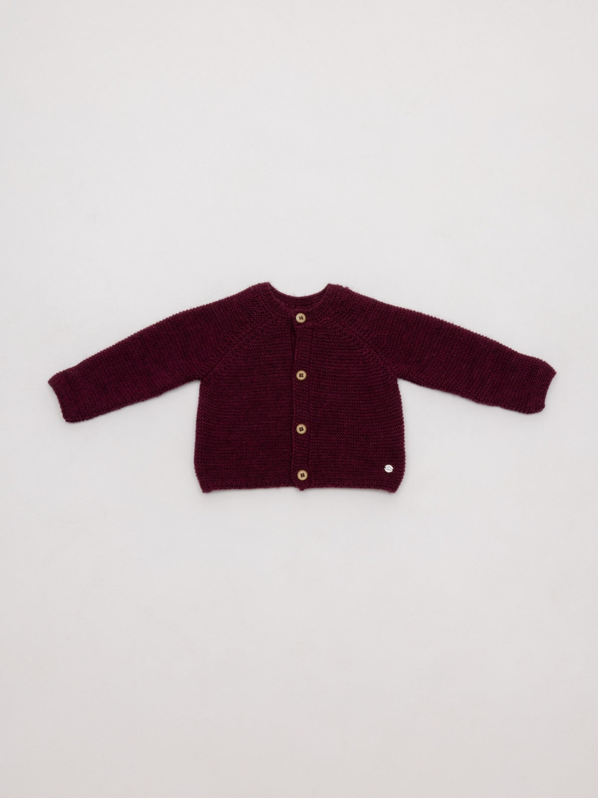 Chaqueta de punto para bebé niño en color granate. Confeccionada en 80% acrílico, 10% lana y 10% viscosa. Detalle botones a contraste en madera. Manga ranglan. Chapita Nanos en lateral izquierdo. Ideal para los días de invierno, sin perder estilo y comodidad.