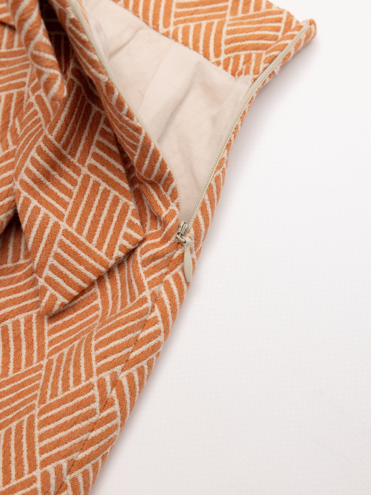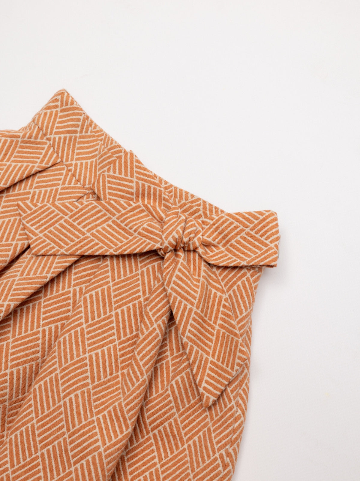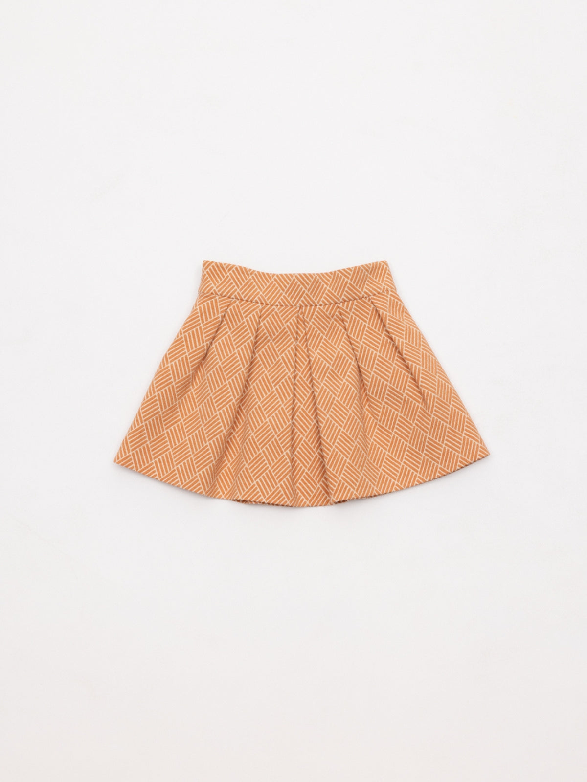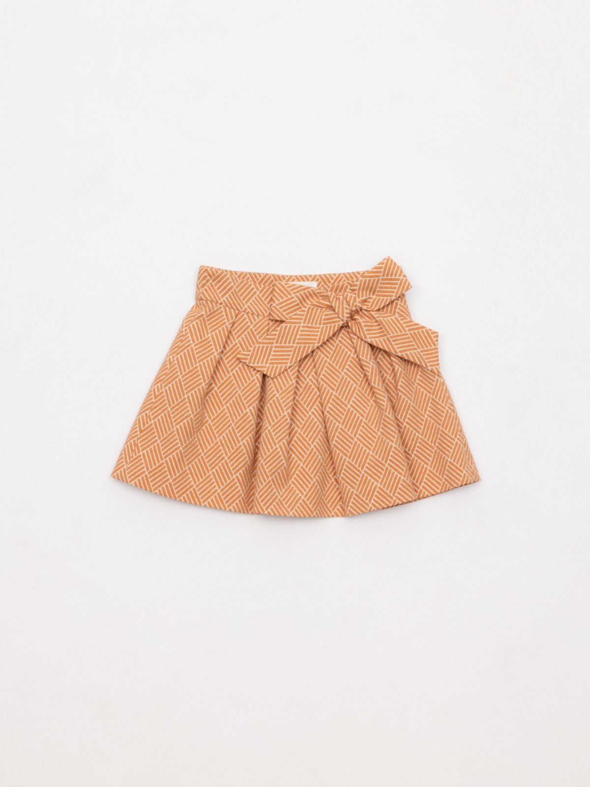 Falda corta estructura para niña en color naranja. Confeccionado en 60% poliéster, 35% algodón y 5% poliamida. Forro en 100% algodón. Detalle lazo frontal y cremallera lateral. Una prenda versátil, ideal para completar looks de diario o conjuntos más especiales.