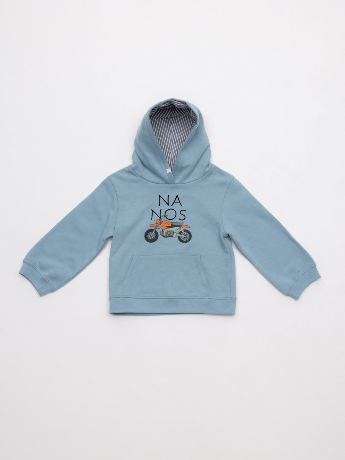 Sudadera felpa con capucha para niño confeccionada en 100% algodón en color azul. Print frontal moto. Forro interior de rayas a contraste en capucha. Bolsillo canguro. Detalle etiqueta Nanos en capucha. Una prenda cómoda y estilosa, perfecta para el día a día.