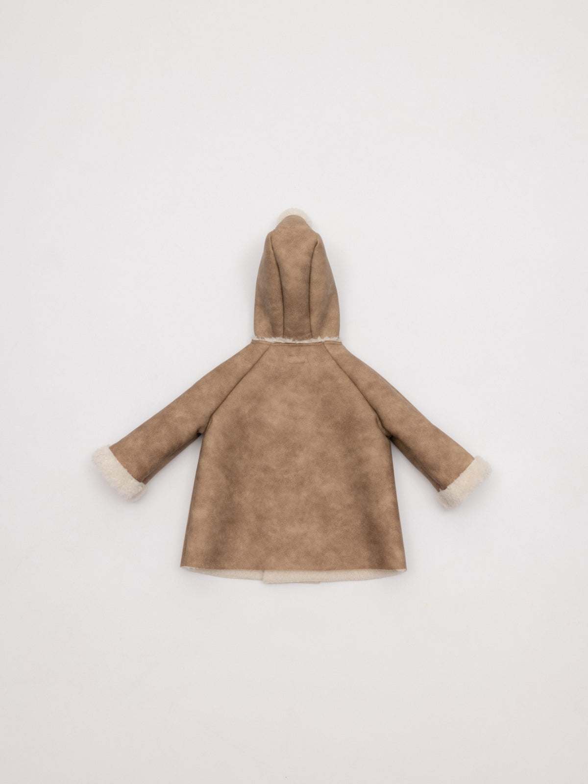Trenka doble faz unisex con capucha para bebé en color caramelo. Abertura frontal cruzada con cierre de doble botón en la parte superior. Detalle borreguito en interior, capucha y puños. Una prenda clásica y versátil, perfecta para los días fríos.
