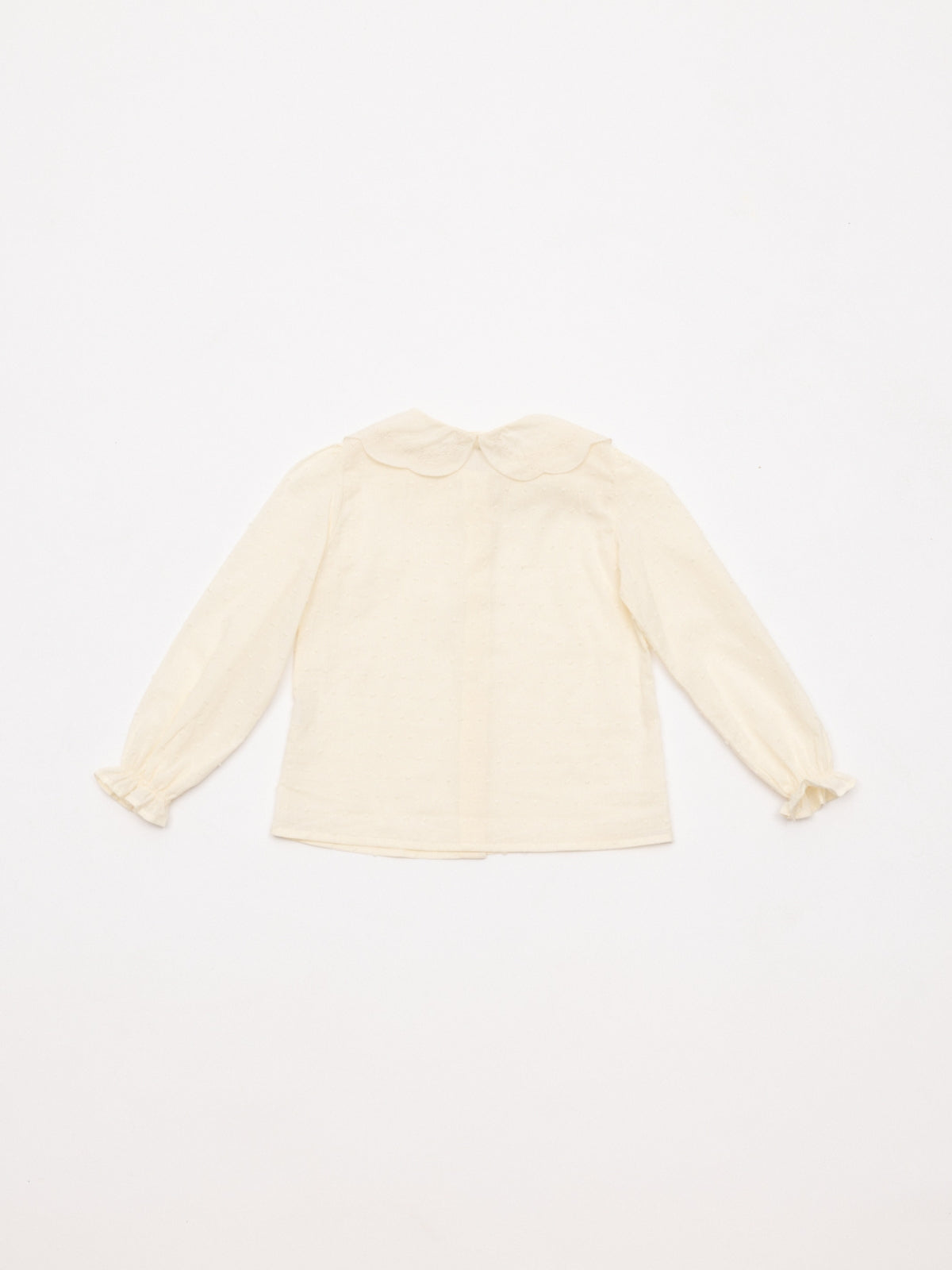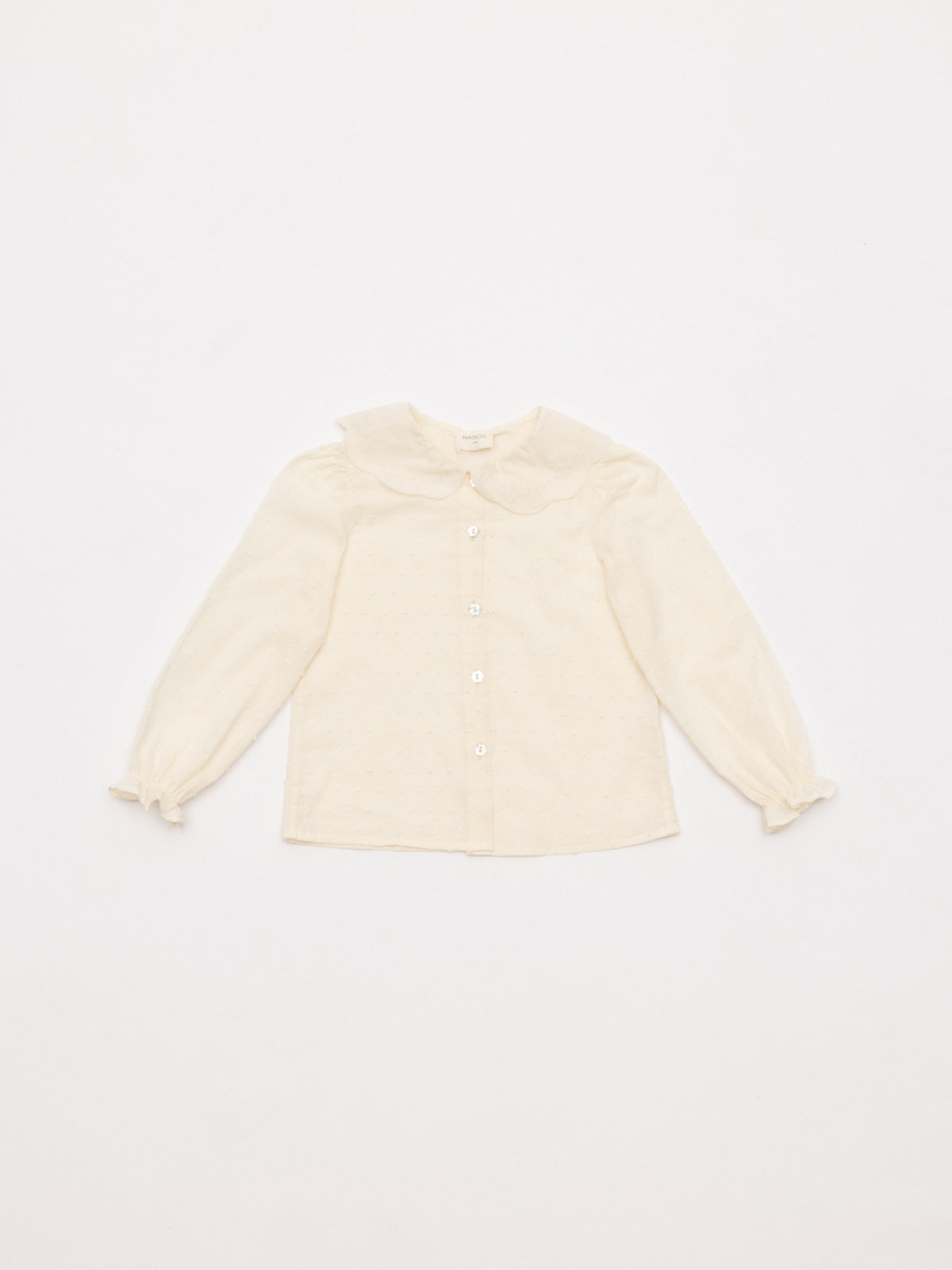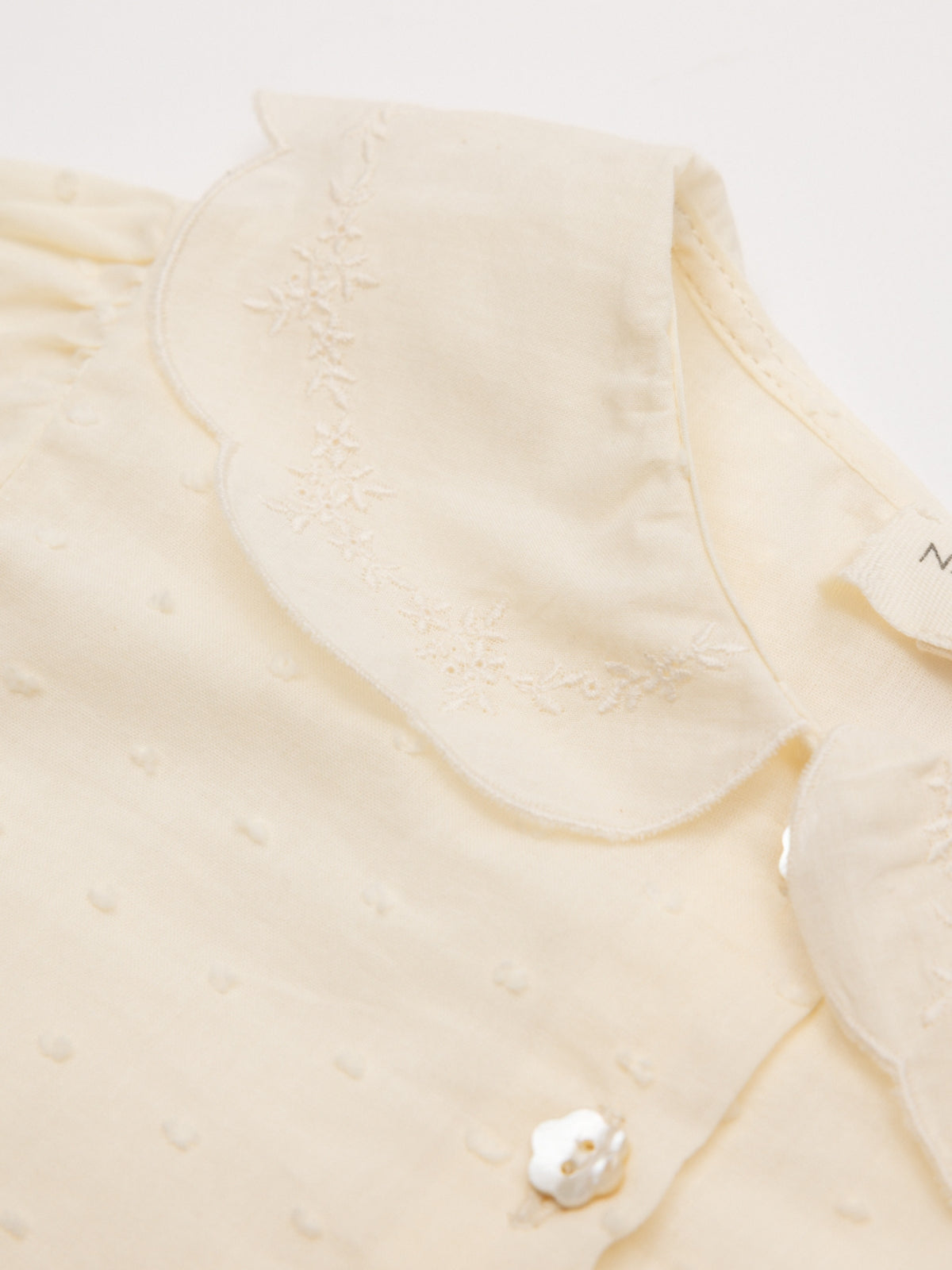 Blusa plumeti cuello bordado para niña en color nata. Cuello bebé adornado con bordados. Abertura delantera con cierre de botones a tono. Manga larga con puño elástico. Una prenda cómoda y versátil, ideal tanto para el día a día como para ocasiones especiales.