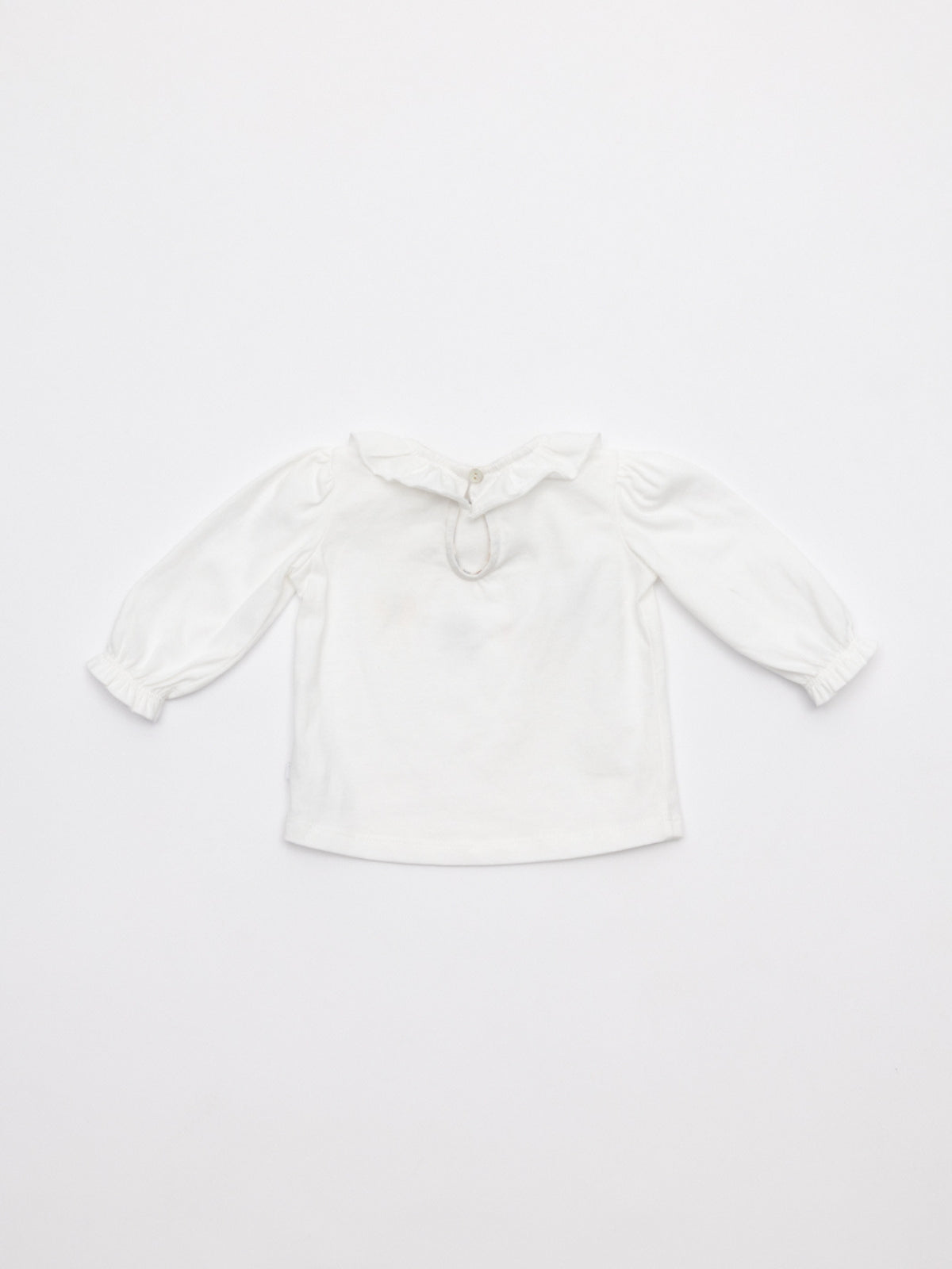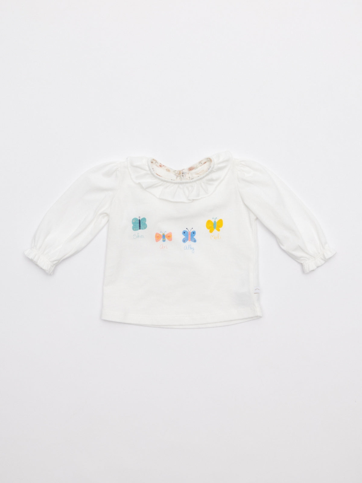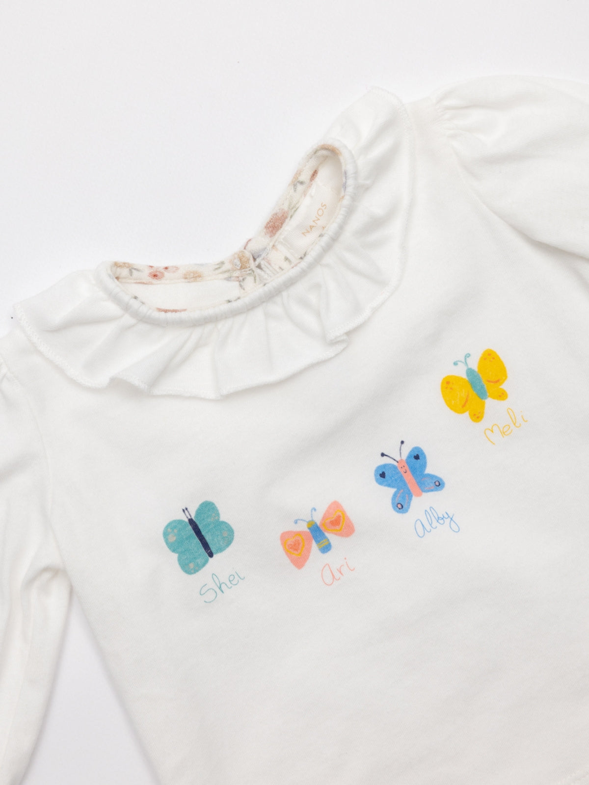 Camiseta para bebé niña confeccionada en 100% algodón en color nata. Detalle cuello volante. Print frontal mariposas. Abertura trasera con cierre de botón. Un básico estiloso y alegre.