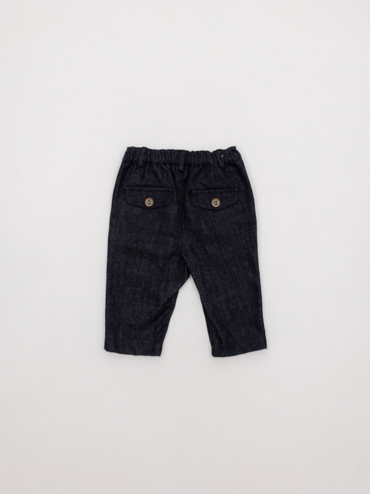 Pantalón chino loneta perchada en color azul marino. Cierre en cintura con botón y gomas para mayor sujeción. Bolsillos laterales y traseros. Detalle etiqueta en bolsillo lateral.