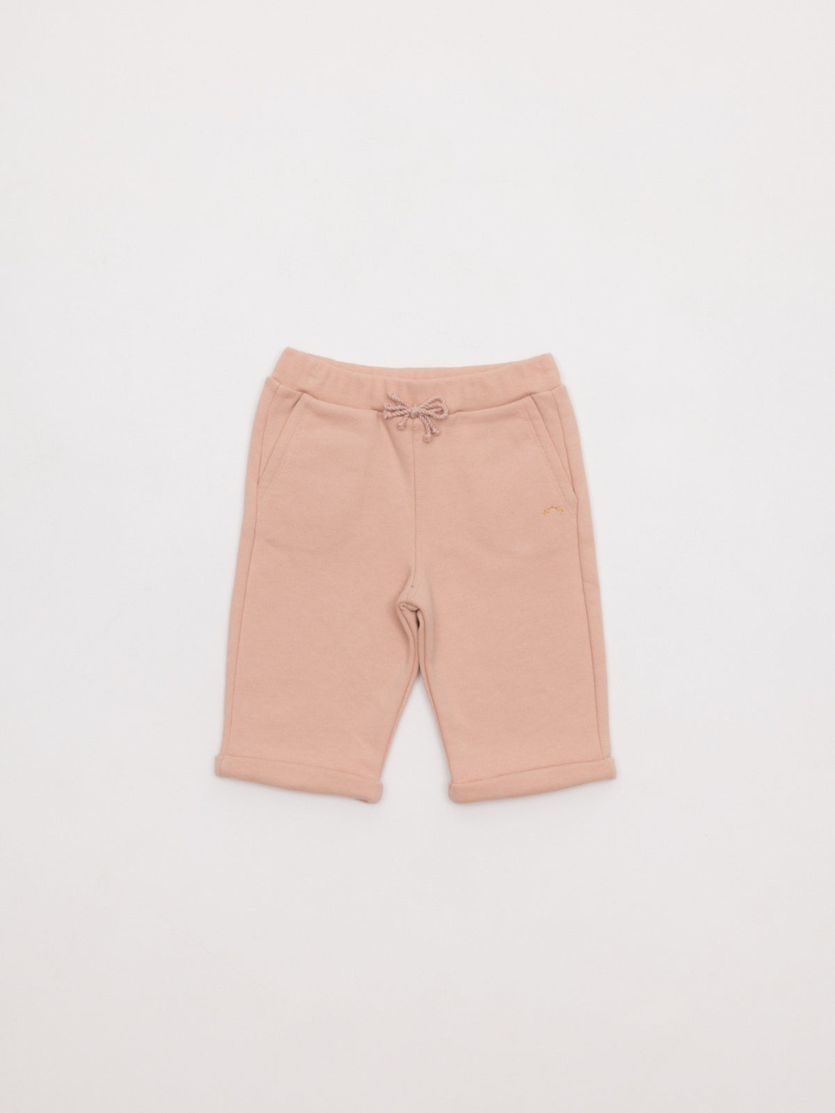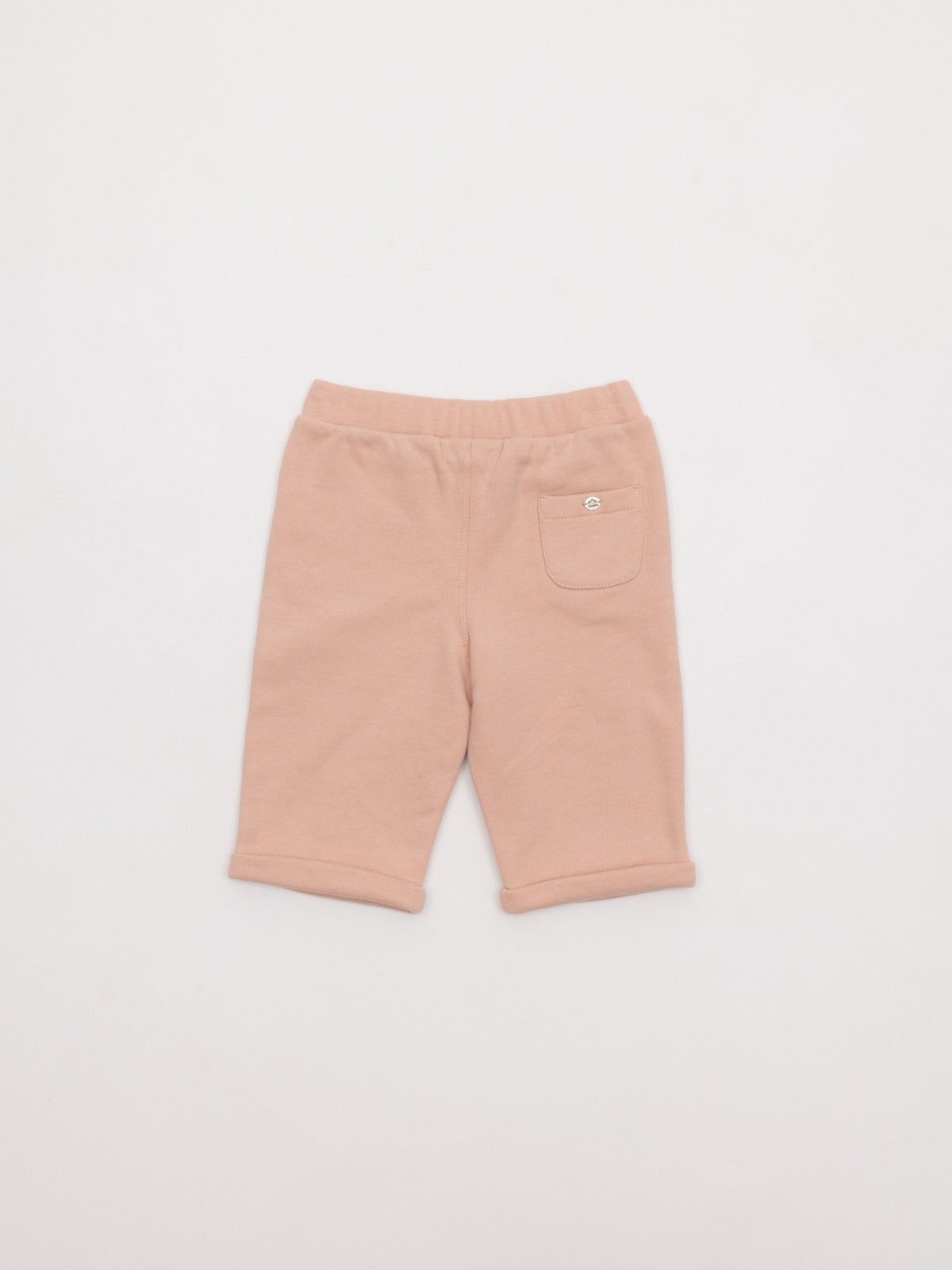 Pantalón felpa para bebé niña en color rosa palo. Detalle lazo de cordón en frontal. Bajo con doblez. Bolsillos laterales. Una prenda estilosa y cómoda, perfecta para el día a día.