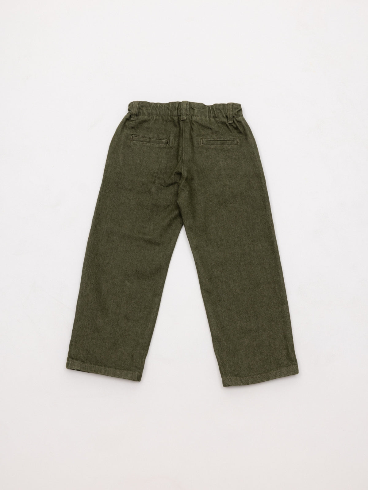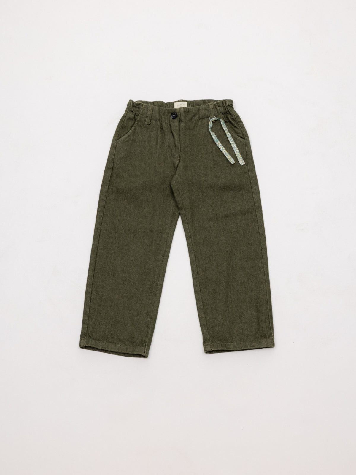 Pantalón sarga soft para niña en color verde. Detalle lazo en cintura estampado Liberty. Cierre con botón y cremallera. Gomas en cintura para mayor ajuste. Un diseño práctico y versátil, ideal para el día a día.