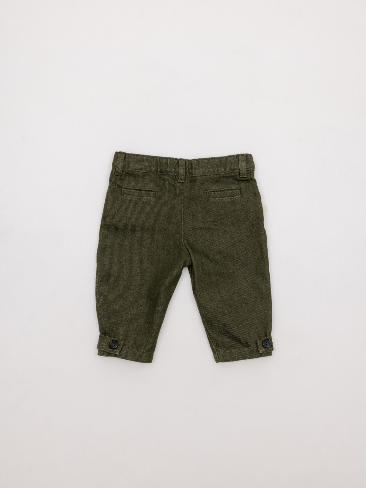 Pantalón sarga soft para bebé niña en color verde. Detalle lazo en cintura estampado. Bajo con ajuste de botón. Cierre con botón y cremallera. Gomas en cintura para mayor ajuste. Un diseño práctico y versátil, ideal para el día a día.