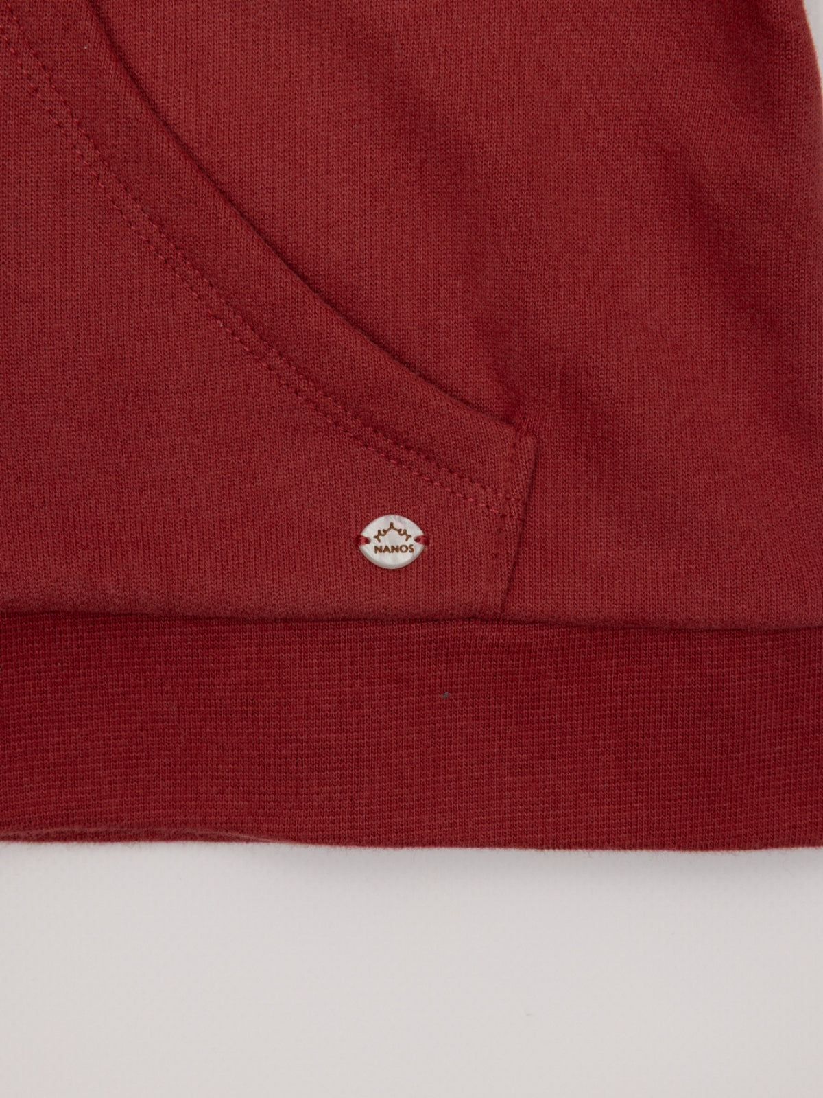 Sudadera felpa con capucha para niña confeccionada en 100% algodón en color granate. Detalle volante y print de perro en frontal izquierdo. Forro interior floral a contraste en capucha. Detalle puño mangas. Cremallera delantera y bolsillos. Chapita Nanos en lateral izquierdo. Una prenda cómoda y estilosa, perfecta para el día a día.