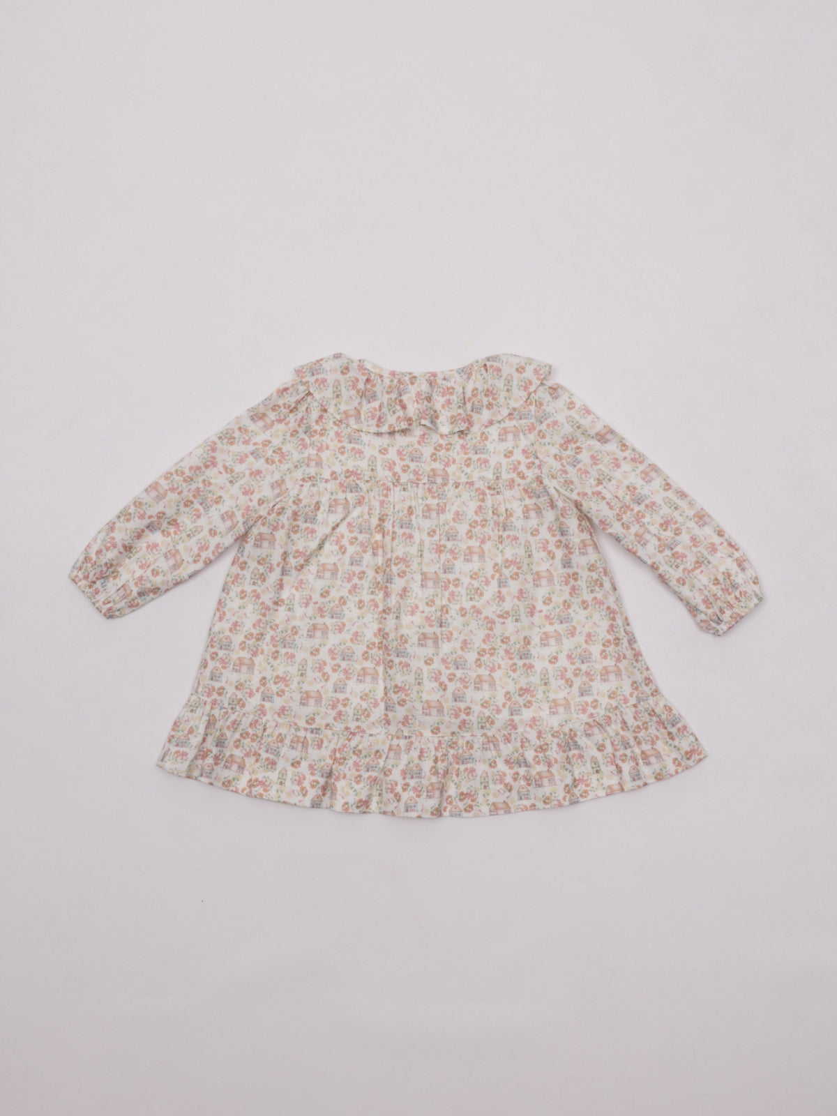 Vestido estampado para niña en color nata. Estampado casitas. Detalle cuello volante. Abertura delantera con cierre de botones. Volante en bajo.