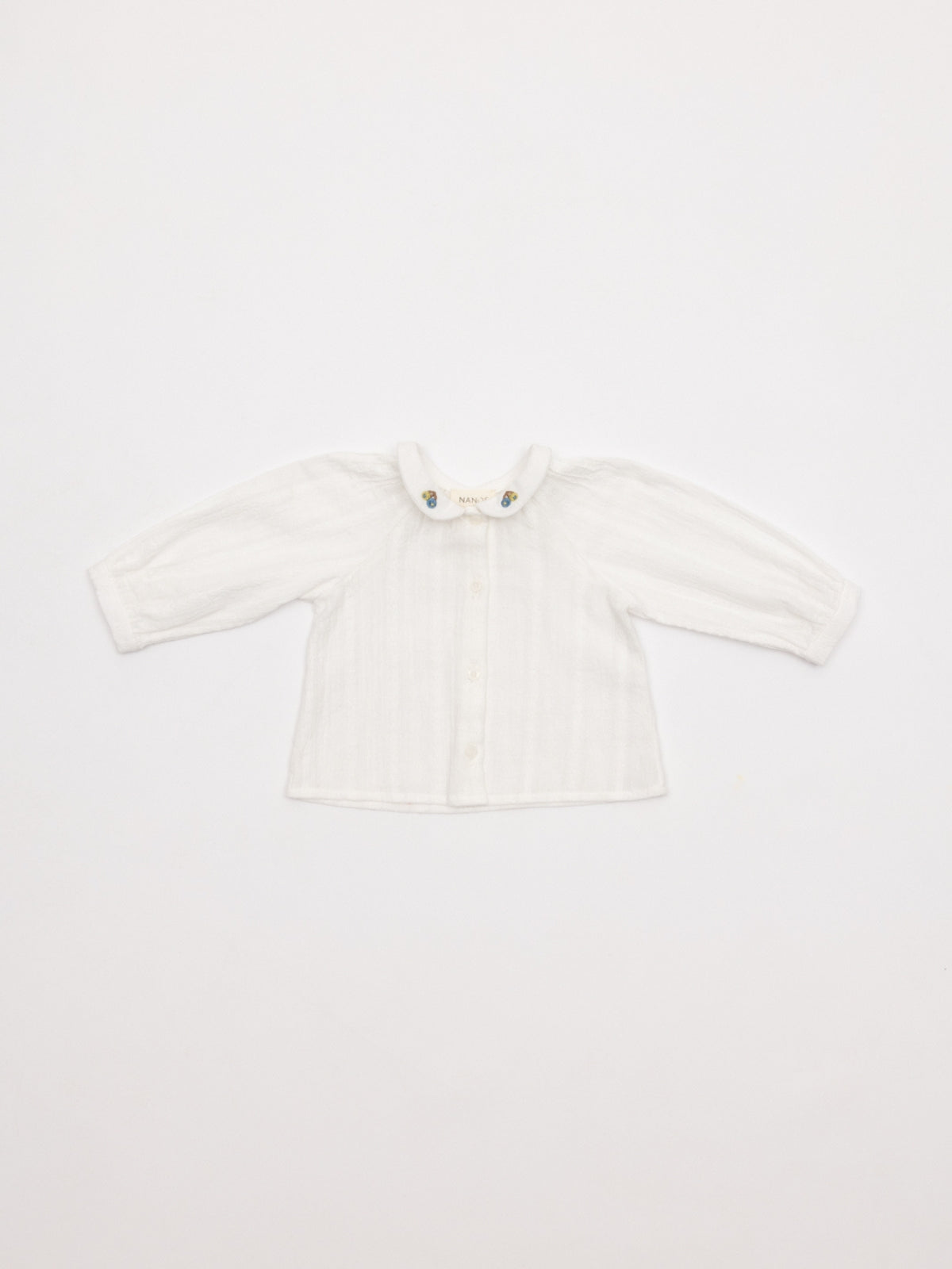 Camisa estructura para recién nacido en color blanco roto. Detalle cuello con bordado. Abertura delantera con cierre de botones a tono. Botones en puños. Un diseño elegante y cómodo, ideal para las primeras ocasiones.