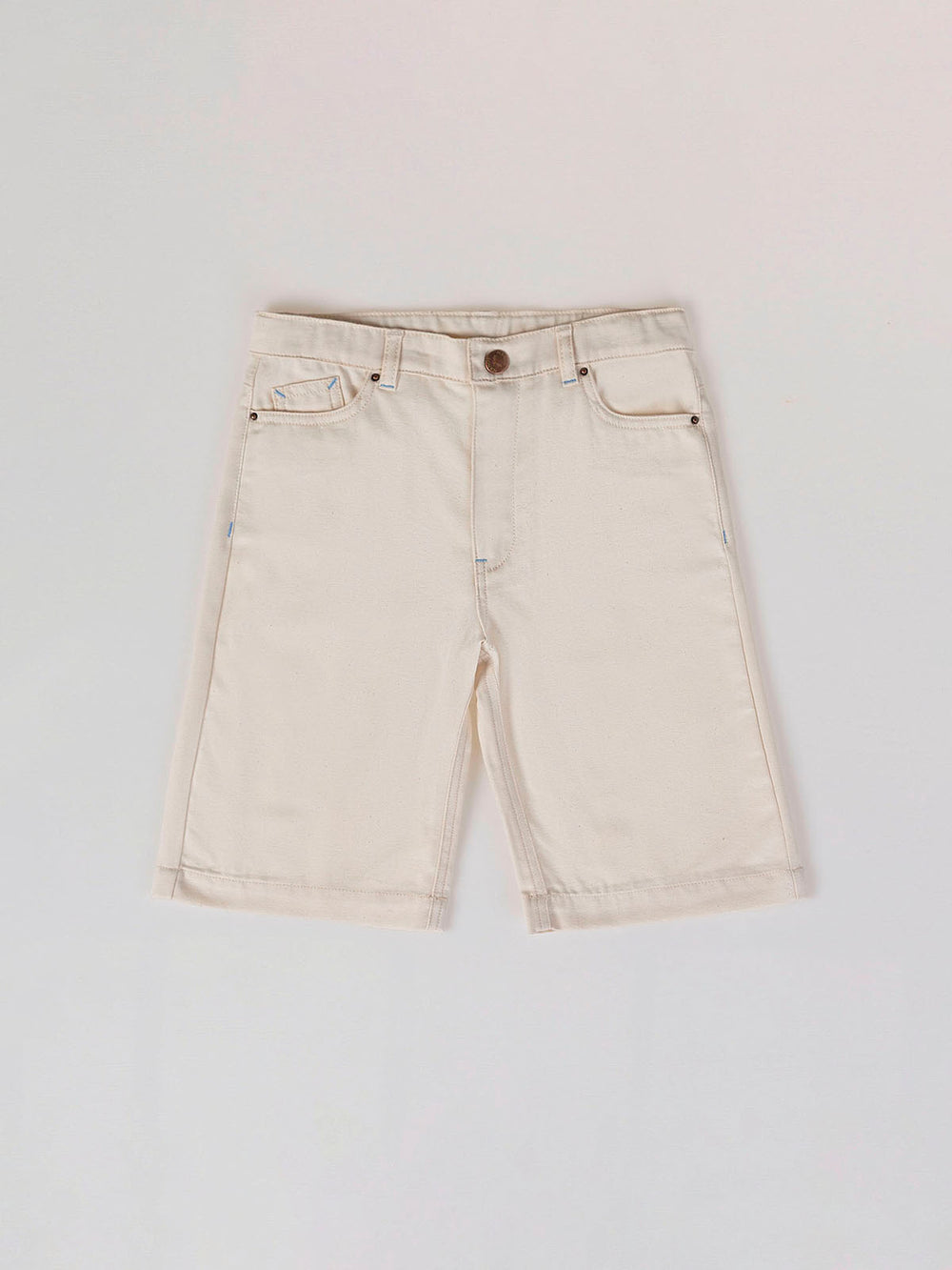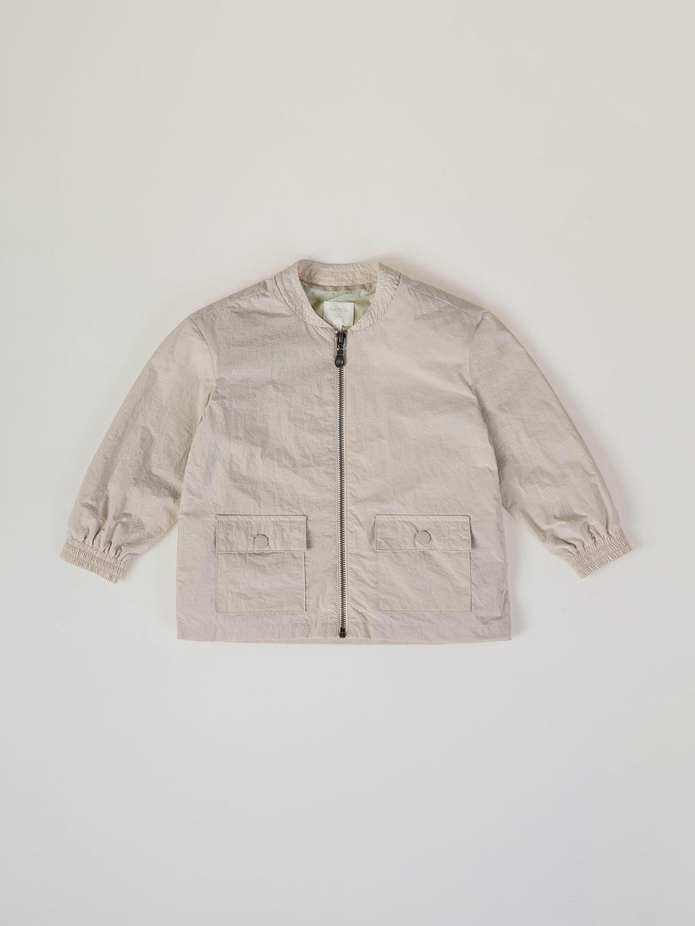 Camisa con cuello mao para niño en color beige. Confeccionada en 55% lino y 45% algodón. Cierre en la parte delantera con botones a contraste en color blanco. Mangas con cierre de botón. Falso bolsillo en la parte delantera derecha. Detalle logo Nanos bordado con hilo metalizado en delantero izquierdo.