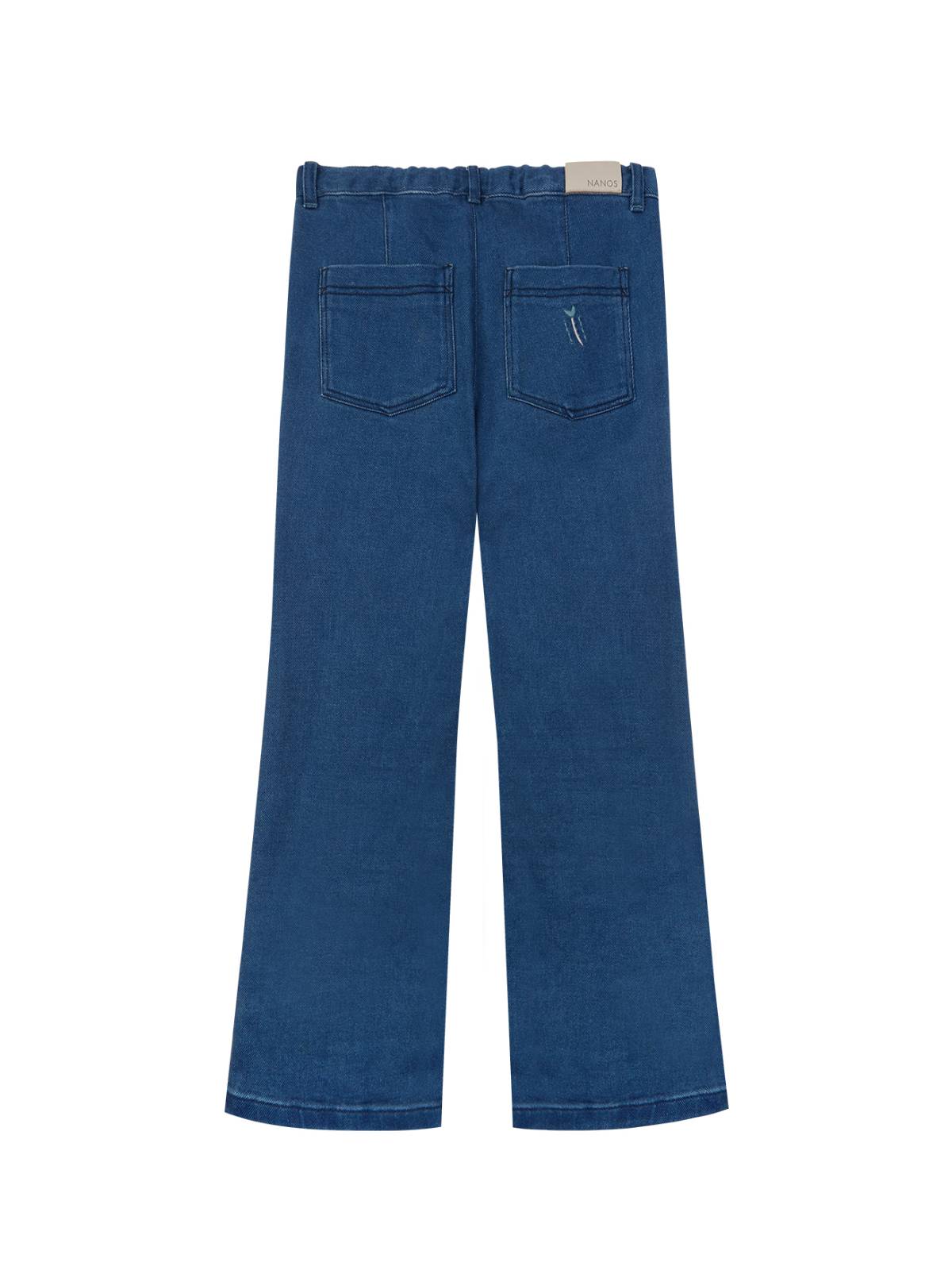 Pantalón culotte denim para niña en color azul. Bolsillos delanteros y bolsillos traseros. Cierre con botón y cremallera. Gomas ajustables en cintura. Detalle chapita Nanos en delantero izquierdo. Detalle bordado en bolsillo trasero.
